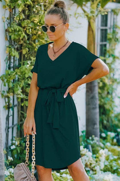 V Neck Waist Tie Solid A Line Dress: GREEN /